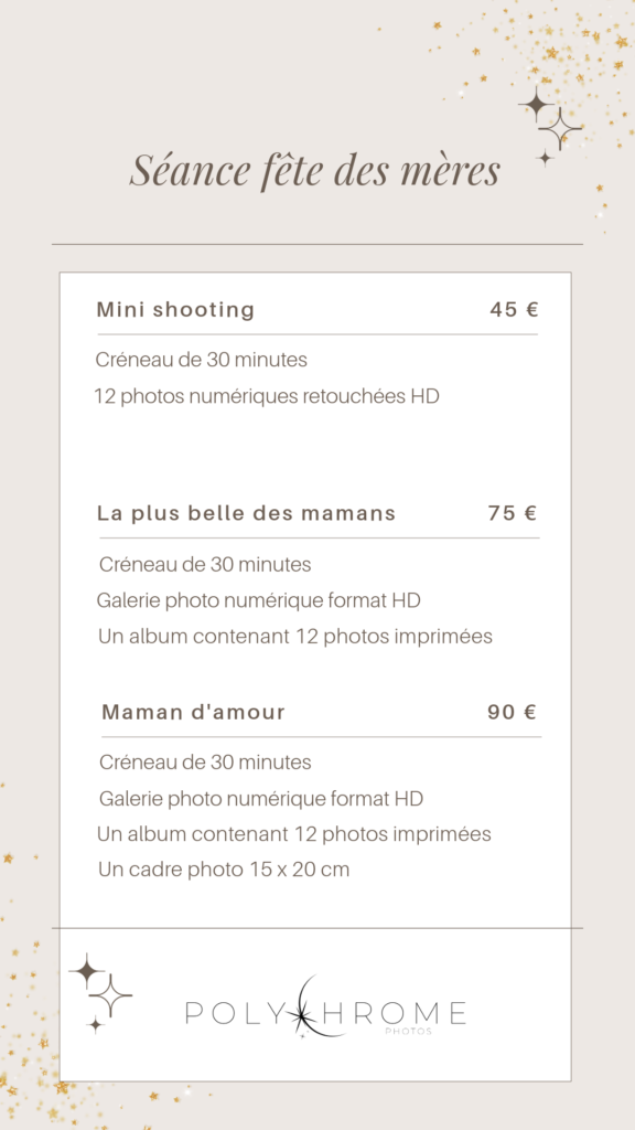 En plus de la séance, vous aurez, dorénavant, la possibilité de choisir une formule livrée avec un album photo contenant 12 photos imprimées, ainsi qu’un cadre photo 15 x 20 cm.